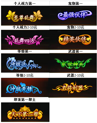 称 号:当玩家在以下排行榜上到达一定的名次,可获得华丽大气上档次的称号!玩家可以在【角色】-【称号】-【名人】处查看各个称号的获得规则和佩戴称号。玩家头顶最多3个称号哦!
