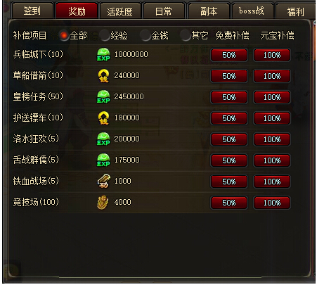 很多副本或者活动没有时间参与,玩家可以在【奖励】处领取补偿。次数越多补偿越多,有累计次数上限,所以还是要记得去参与哦!
