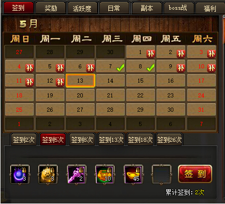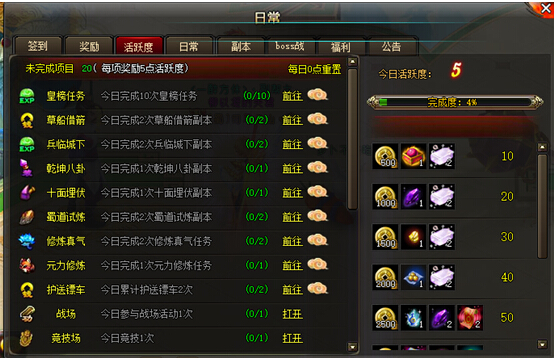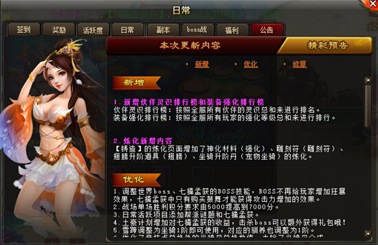 日常系统包括七大部分:签到、奖励、活跃度、日常、副本、boss战、福利、公告