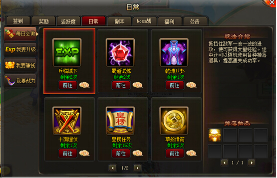 日常界面左边列出了分类:每日必做、我要升级、我要赚钱、我要战力,玩家可根据自己的偏重选择对应分类里面的活动去参与。