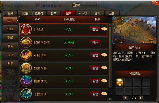 玩家可在副本界面查看所有副本,查看每日副本剩余次数、副本掉落,亦可直接点击【前往】按钮自动寻路或者云朵飞至副本NPC处。副本是每日必做的哦!至于副本的玩法可以查每个副本的相关介绍。