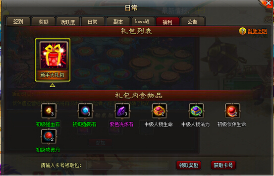 顾名思义,福利就是福利,正如诸多男同胞们经常在男同胞群发的福利图……咳咳,回到正题,福利的话主要是礼包领取处。诸如新手卡、媒体礼包等均可从此处领取。