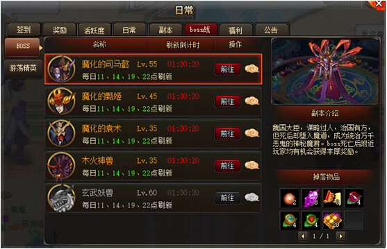 在日常系统里面可打开boss战界面查看相关信息和参与相关的争夺。Boss战的相关玩法介绍可查看相关文档。