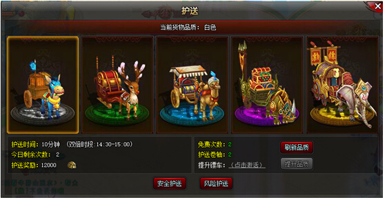 2、镖车有品质之分,刷新品质可以获得高品质的镖车,越高品质的镖车奖励越丰厚。每天有2次的免费刷新次数,此外可通过元宝购买或者消耗护送卷轴来刷新品质,护送卷轴可通过职业任务或者每日必做宝箱中获得。