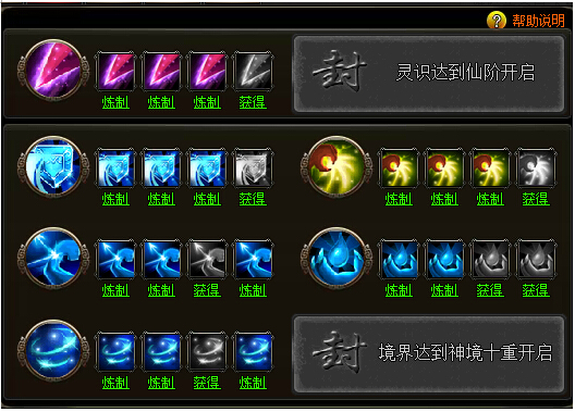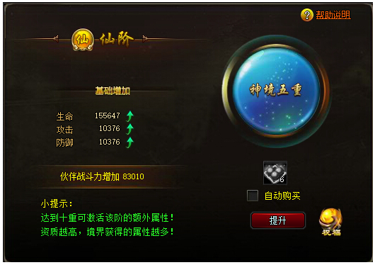 境界分为凡、灵、仙、神四大阶级,每阶十重。提升成功则加一重,失败可以获得祝福值,祝福值满自动升级。每达到十重则激活当阶,并且获得额外的属性。