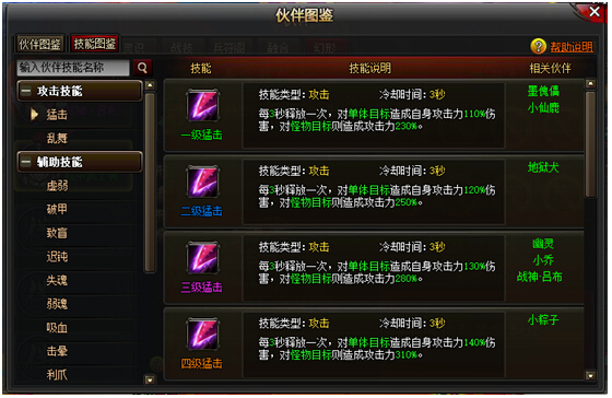 技能图鉴:可以查看所有伙伴技能,包括技能说明和携带相关技能的伙伴。
