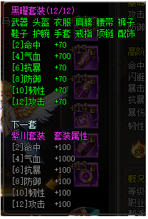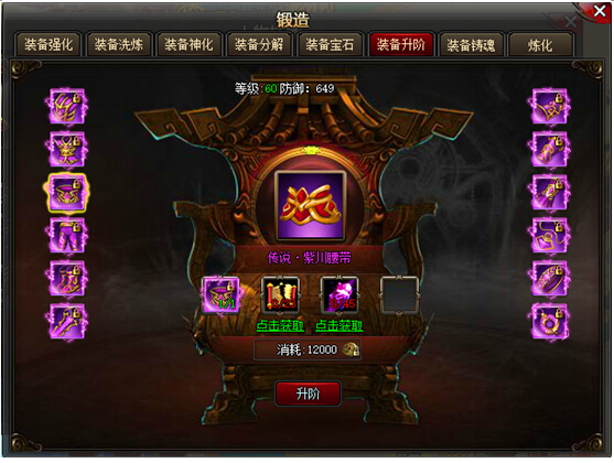 更高等级的紫色套装:在【铸造】内的【装备进阶】里面将低等级的紫色套装升阶为高等级的紫色套装,所需的材料可通过副本获得。