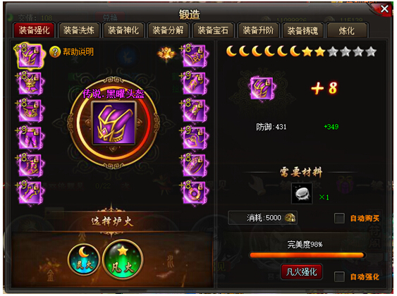 2、高阶炉火可强化的最大等级不能超过上一阶炉火的当前强化等级。举例说明,当一件装备凡火强化+10,它的灵火强化最多只能到10。如果想要提升,先提高上一阶的当前强化等级。