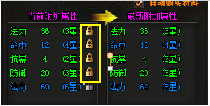 锁定功能:装备有些属性想保留,有些想重洗,可以锁定那些想保留的属性,这样在洗炼的时候他们就不会变化了哦!当然,锁定的属性个数要低于能洗出的最大附加属性个数。锁定需要消耗道具洗练锁。