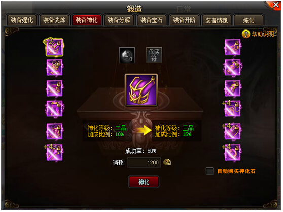 装备神化可以按照百分比增加装备强化属性(所有炉火),让装备强化的效果越大。越高级的神化加成强化的属性越高。最高神化到十二品(神品),加成110%的强化属性。