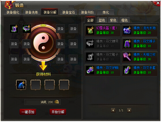 一键添加:为了避免玩家繁琐地操作,可以一键添加背包中满足分解条件的装备。