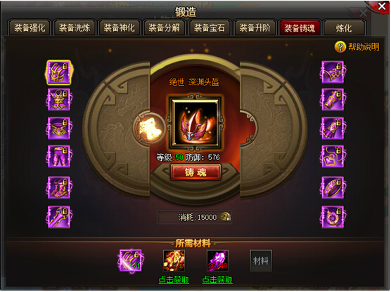 2)装备铸魂所需的材料可通过十面埋伏副本、开锦囊、精英过关斩将系统获得,均会明确列出来,鼠标放在上面即可查看获得该材料的办法。