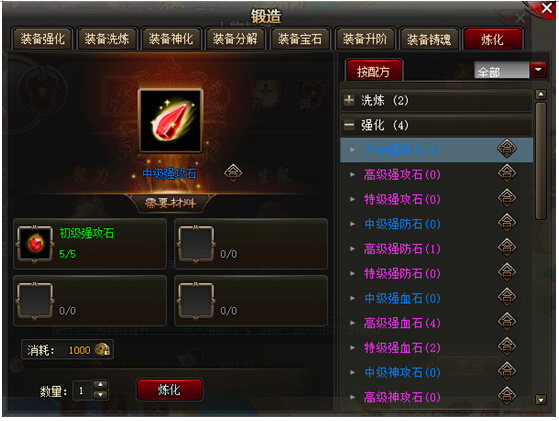 炼化系统集成了N多配方,可以让玩家把低级材料直接炼化成为高级材料以供使用。