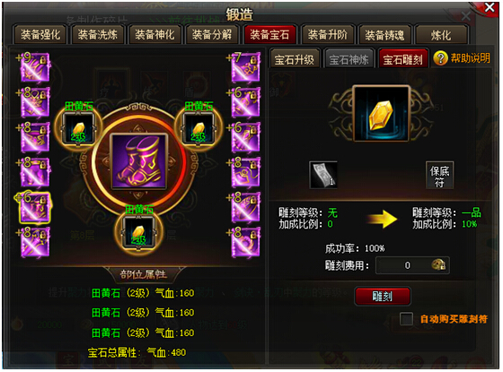 5)可使用祝福符保护雕刻的时候不掉品,祝福符可开锦囊获得,或者在炼化处合成。