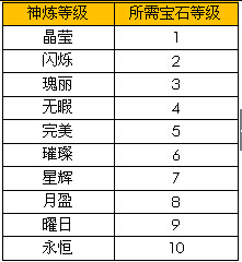 装备60级紫色套及以上的部位可激活宝石神炼功能。神炼即是强化宝石,能给宝石增加大幅属性加成。神炼的等级不能超过宝石等级。神炼同样需要消耗宝石精华。