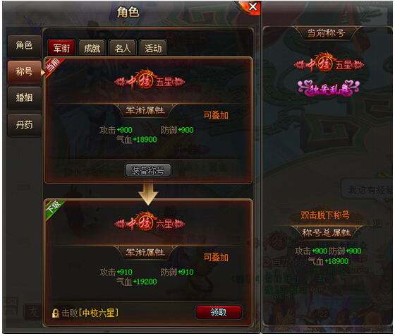 此外:通关关卡可以获得对应的军衔,军衔称号可在【称号】面板内查看。军衔称号属性非常高,值得拥有!