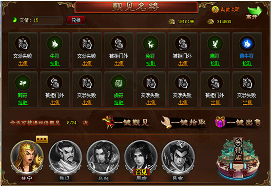 一键出售:点击可以自动把界面内的所有“交涉失败”和“被拒门外”出售获得铜券。