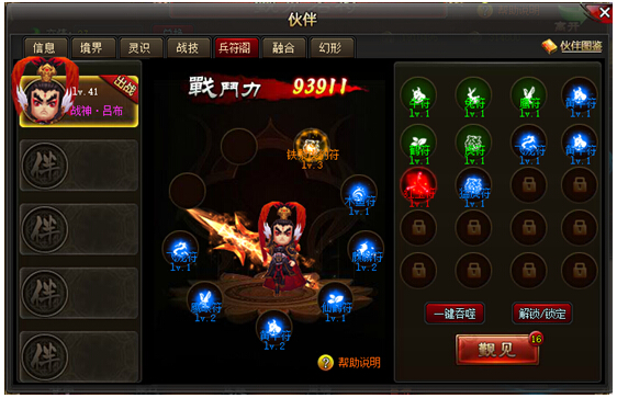 1、伙伴能穿戴兵符的数量由开启的格子决定,格子的开启和宠物境界关联。宠物境界越高,开启的格子越多。