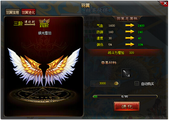 1、商城购买“凝炼之羽”可对羽翼进行升阶,点击自动购买更加方便快捷。