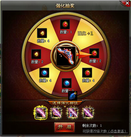 3)强化抽奖:选择强化部位,然后开启转盘,转到哪个格子即可获得对应格子的奖励。运气好的话可以直接部位强化等级+1哦!