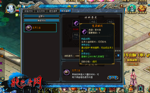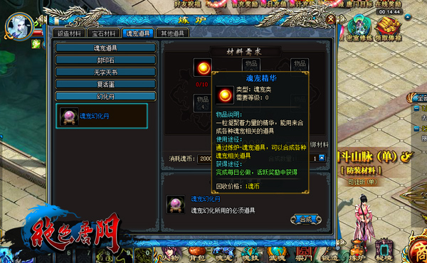 魂宠道具,显而易见是与魂宠息息相关的。比较特殊的是,这个类目下的所有物品,比如魂宠丹、无字天书、幻化丹等物品,所需要的合成道具都是魂宠精华,收集魂宠精华是不是也变得刻不容缓了呢?
