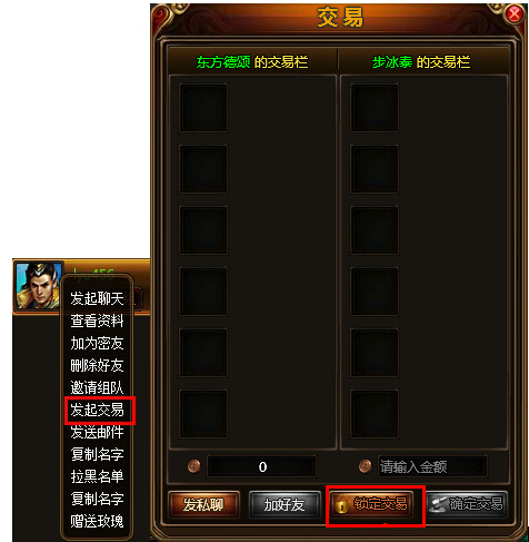 第二步 对方确认交易后,双方的界面会弹出交易界面。 第三步 将需要交易的物品用鼠标左键或者拉放到对应交易框内,在货币输入框输入相应的货币数量。 第四步 最后双方都锁定交易进行最后的确认,点确认交易,即可完成交易。