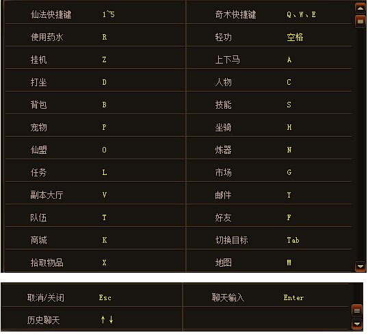 在《笑傲九天》中,大部分操作都可以通过快捷键快速完成,以下为游戏初始快捷键设定。您可以在设置面板中修改这些设定。技能快捷键可以在技能面板中设定。