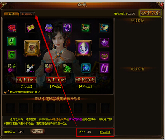 玩家通过抽奖有机会获得秘境宝物,在秘境每消耗10元宝就可获得1积分、积分可以积分商城兑换珍品。 3、秘境仓库