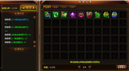 秘境抽奖所获得的极品道具会储存在秘境仓库中,点击进入秘境仓库即可取出
