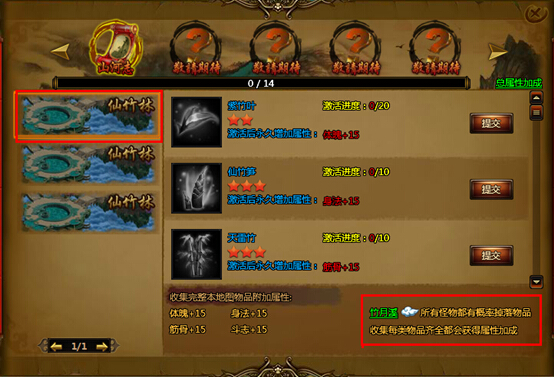 进入游戏主界面功能区点击“奇遇”图标即可进入该界面,目前只开放“山河志”,后续篇章敬请待续。 一个卷轴分为三个部分: 首先点击仙竹林,界面右下方有提示到哪个地图击杀怪物可收集到所需要物品,收集到指定数量的物品即可永久激活对应的属性点,劳者多得,挂机的时候切勿错失哦;
