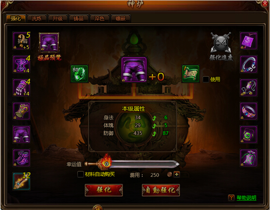 对装备的基础属性进行强化,装备强化将消耗对应额度的费用,强化成功装备属性将有一定数值增长,强化失败属性不变、变成幸运值,幸运值越高成功机率越大。
