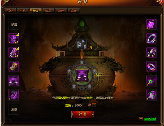 通过提升装备的等级,大幅度提升装备的基础属性,选择所需升级的装备,即可显示装备升级所需材料、升级效强预览;确定升级材料充足时,点击“升星”按钮即可100%升级成功;