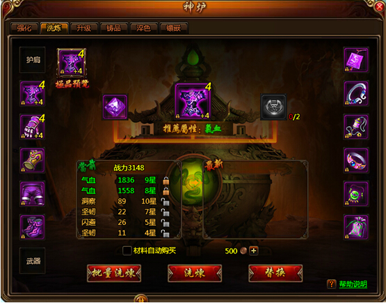 选择希望冼炼的装备,即可显示装备冼炼所需材料,材料充足时,点击“冼炼”按钮即可进行冼炼;