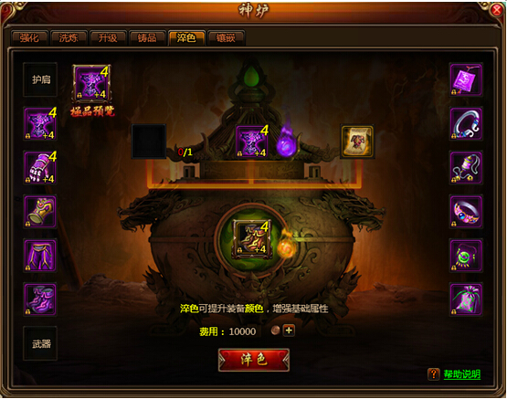 选择想要淬色的装备,即可显示装备冼炼所需材料,材料充足时,点击“淬色”按钮即可进行;