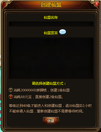 创建仙盟角色达到40级、建立1级仙盟会消耗30万非绑定铜币、消耗88元宝或仙盟令可直接创建2级仙盟,在上方的仙盟名称中输入心仪的仙盟名字,点击创建,即可创建仙盟成功,创建之后就可以开始寻找志同道合的兄弟啦!
