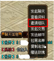 方法一:在聊天窗口中鼠标左键点击对方角色名,在菜单中选择“邀请组队”,对方同意后,组队完成。
