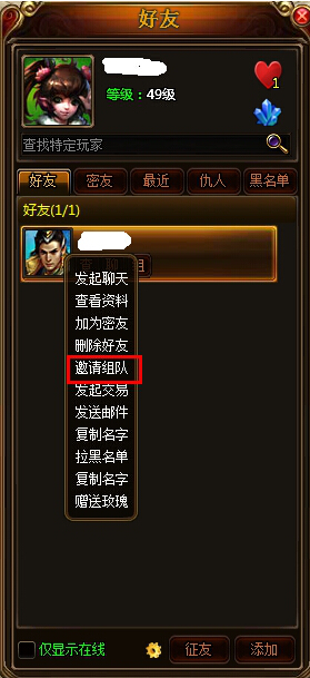 方法三:按F打开好友界面,在好友界面选中想要组队的玩家名字,左键点击后在弹出的菜单中选择“邀请组队”,对方同意后,组队完成。