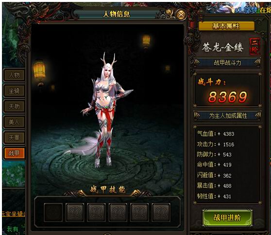 苍龙战甲只要获得即可给玩家永久增加属性。战甲一共分为七阶,每一次进阶成功都能使宠物获得更加酷炫的外形,更多的战斗力,战甲进到高阶时,还会获得额外的技能栏。