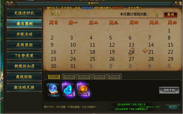 签到次数越多,获得奖励越丰富,VIP玩家还可以使用补签功能来弥补漏签的天数。