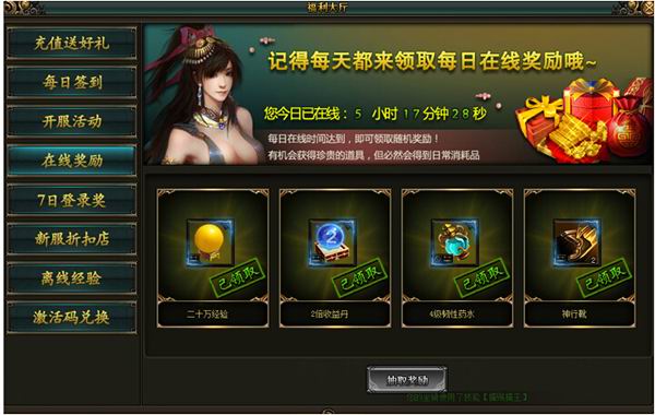 每日在线时间长的玩家,可领取随机奖励,更有机会获得珍贵的道具