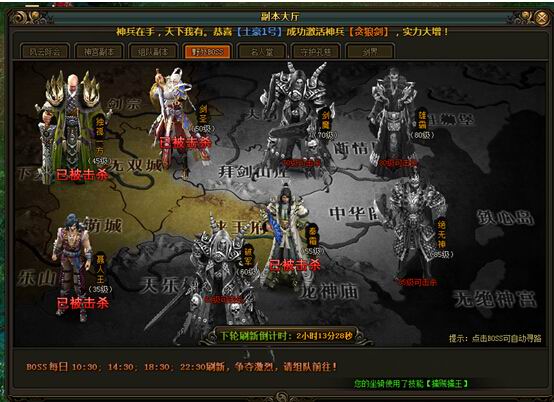4、野外BOSS刷新在野外场景中,需要等级达到场景最低进入等级的玩家才可进入击杀。