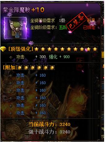 此外需要注意的是,坐骑装备无法手动升级强化等级,在VIP副本和搜神宫副本中,可以获得带有强化等级的稀有坐骑装备。