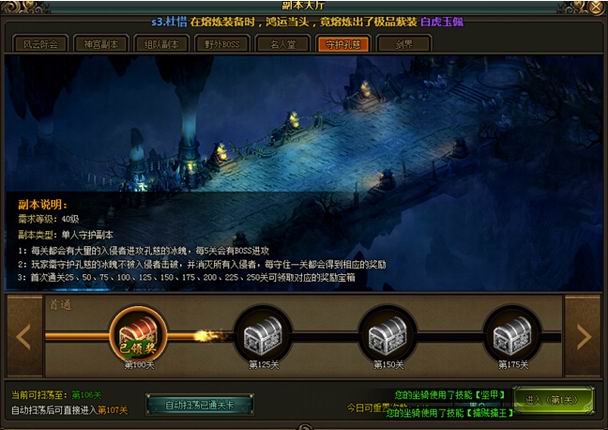 不过即使进入副本内守护,也是非常方便的,副本地图中只有一条宽大的路,在怪物到达孔慈身边之前将他们击败即可,可以在路中间或者路的尽头直接开启挂机,解放双手了,也可以通过自己的技术,结合轻功的跳闪功能,不断的挑战更多波数