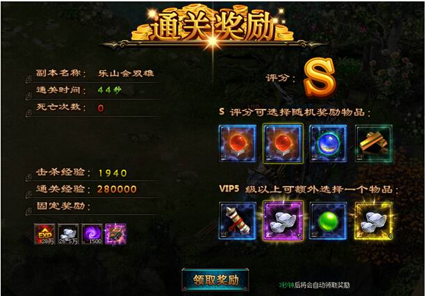 S级通关评分还可以获得额外的一次抽奖机会。有一定概率获得大量经验、真气、银两和礼金。同时,如果你是VIP5的玩家,每次通关都必然可以额外多一次抽奖机会。