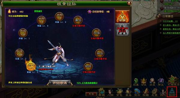 经脉系统,可从游戏下方点击经脉进入。经脉系统分为两部分,分别是经脉和根骨。