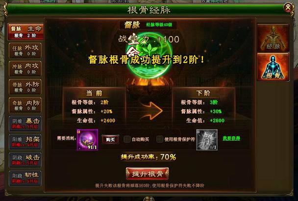 4)根骨值初始为0,最高为100,每次提升成功增加10,对应的属性会根据该经脉当前等级增加;