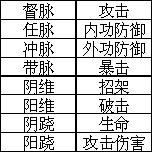 经脉由八个不同的经脉组成,修炼完成后会增加相应的属性,下图为各经脉与相关属性对应表。