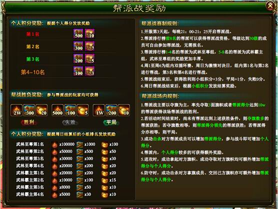 每周排名结算后,按照帮派的排名向各帮派发放奖励,奖励道具将直接发放到帮派仓库中,可由帮主进行分配。