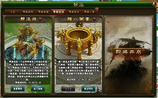 在活动时间内,通过游戏上方的帮派战按钮进入活动场景,也可以通过日常活动面板里的相关条目处点击参加进入。