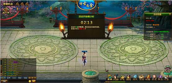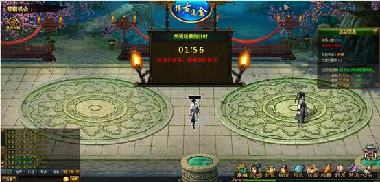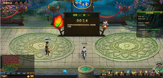 进入游戏场景内,蓝色字体显示的为大侠自己,左上方有隐藏场景内其他人物的按钮,游戏中间为出题区,右方显示当前活动信息。
